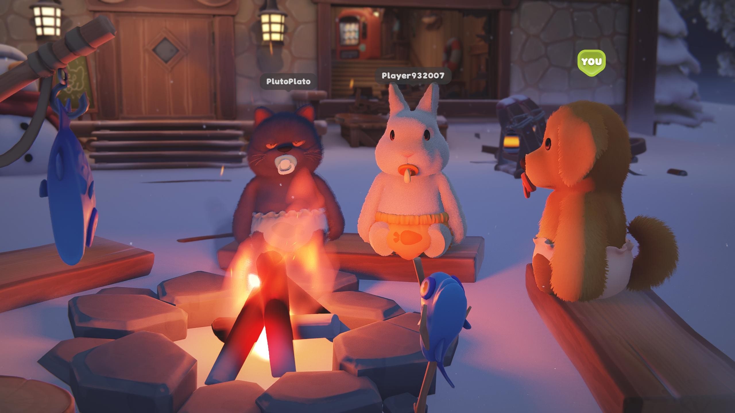 After a long day of slapping, throwing, and waddling in diapers, the baby squad finally settled down for a well-earned break by the campfire. With fish on a stick, pacifiers in mouth, and the soft glow of the fire lighting our fuzzy faces, we shared stories of chaos and cuddles. This is what Party Animals is all about—silly, sweet, and a little bit savage. 🍼🔥❄️