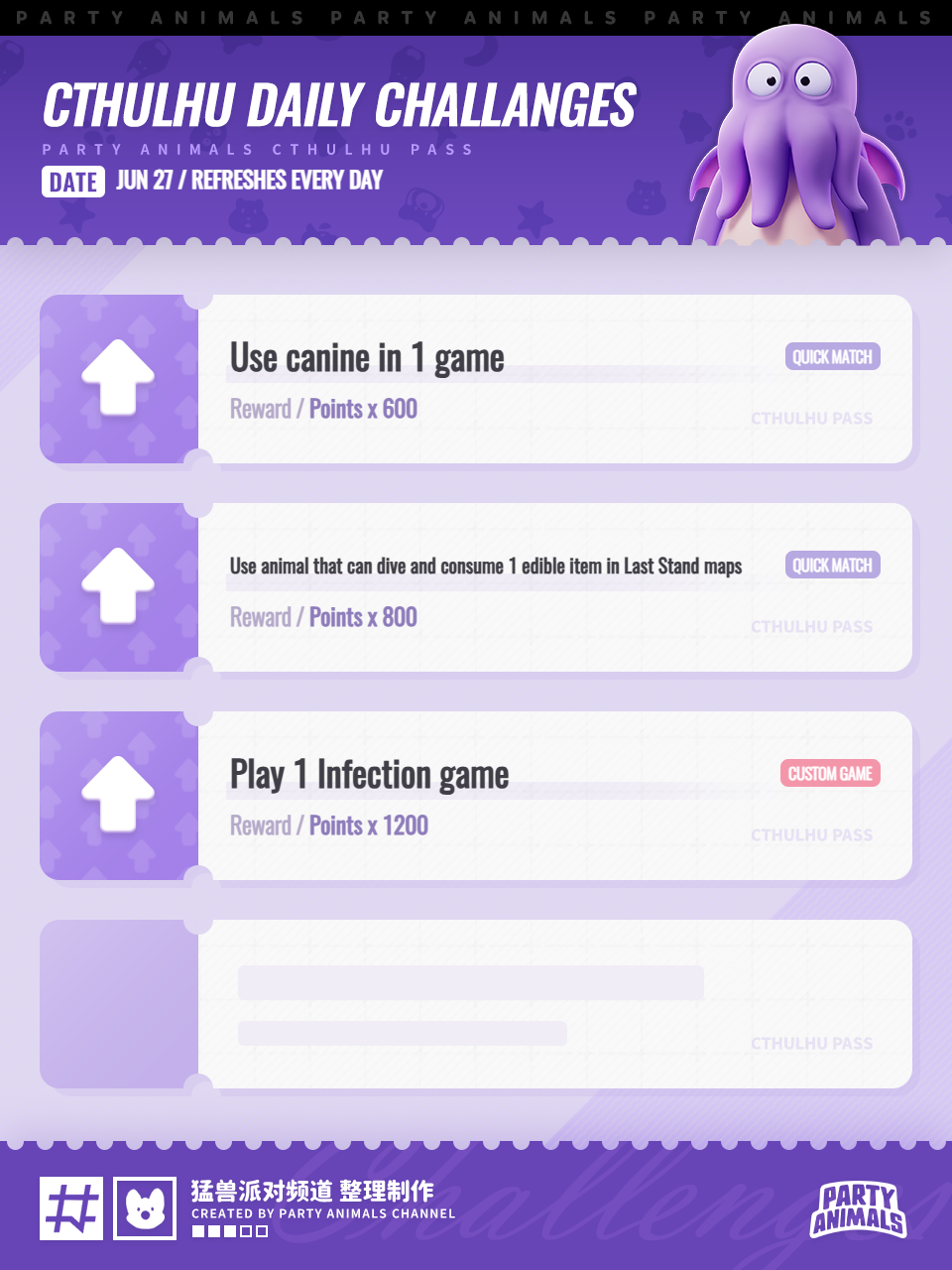 The brand-new free "Cthulhu Pass" is now live in Party Animals! Complete challenges to level up your Pass and unlock cthulhu-themed outfits and more!