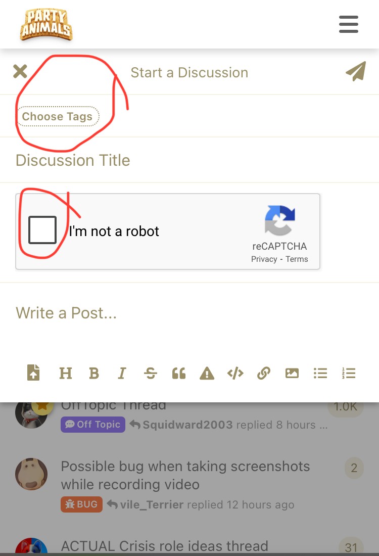 Next, make sure to choose tags or it won’t let you make the thread. Then write the title and make a post. Make sure to do the bot verification thing too!