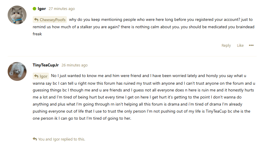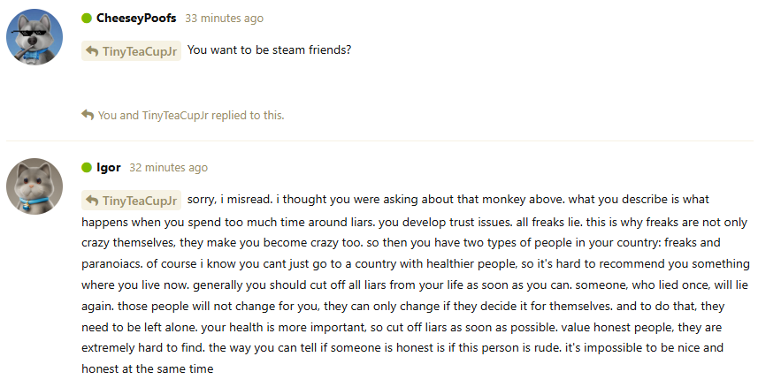 TinyTeaCupJr sorry, i misread. i thought you were asking about that monkey above. what you describe is what happens when you spend too much time around liars. you develop trust issues. all freaks lie. this is why freaks are not only crazy themselves, they make you become crazy too. so then you have two types of people in your country: freaks and paranoiacs. of course i know you cant just go to a country with healthier people, so it's hard to recommend you something where you live now. generally you should cut off all liars from your life as soon as you can. someone, who lied once, will lie again. those people will not change for you, they can only change if they decide it for themselves. and to do that, they need to be left alone. your health is more important, so cut off liars as soon as possible. value honest people, they are extremely hard to find. the way you can tell if someone is honest is if this person is rude. it's impossible to be nice and honest at the same time