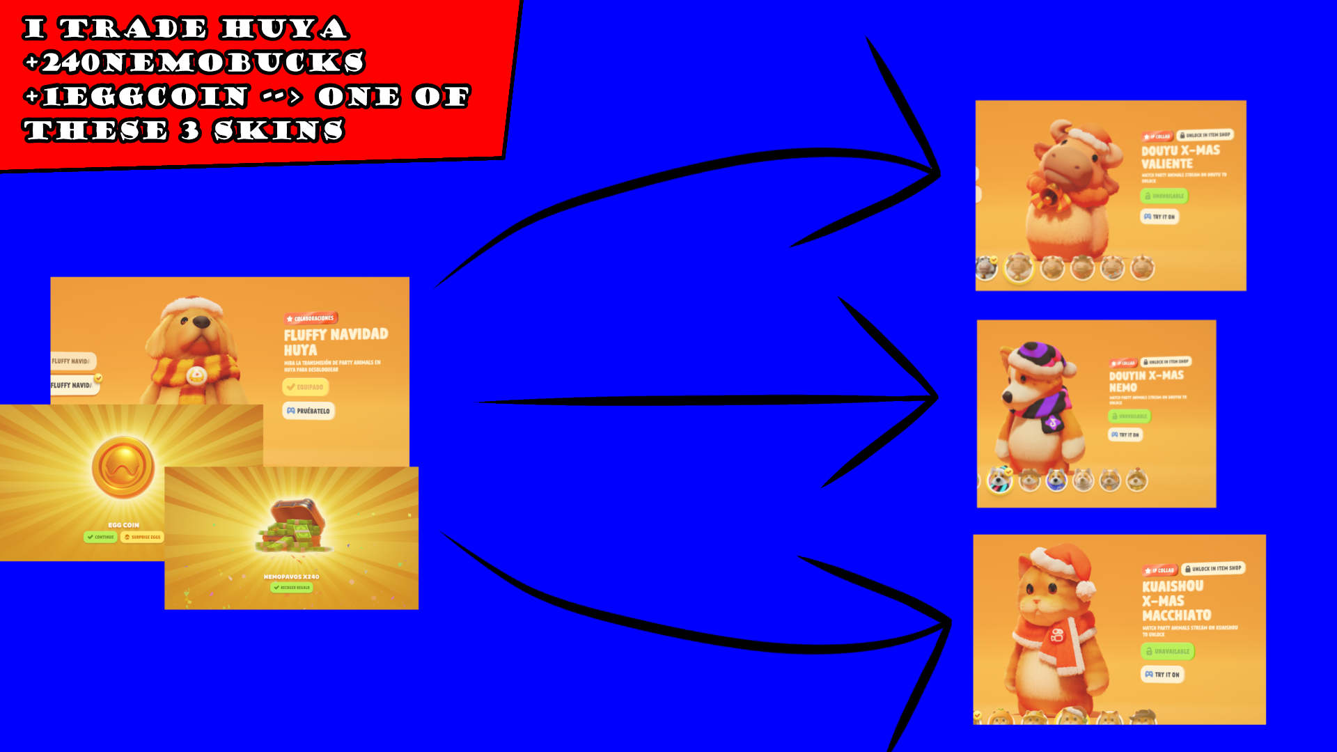 ElMariacchi_A_LOLO_KO_ Hello! I Trade Huya's Christmas skin to one of the following three: -Douya Christmas Skin -Douyin Christmas Skin -Kuaishou Christmas Skin I also have 1 Egg Coin and 240 Nemo Coins that are also included in the offer. Discord: elmariacchi_a_lolo_ko_