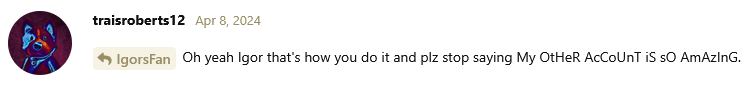 - you are known for your obsession with creating new accounts @traisroberts12 . your own friends confirm us that, and i have already showed many times how you act 1:1 using this and your main account