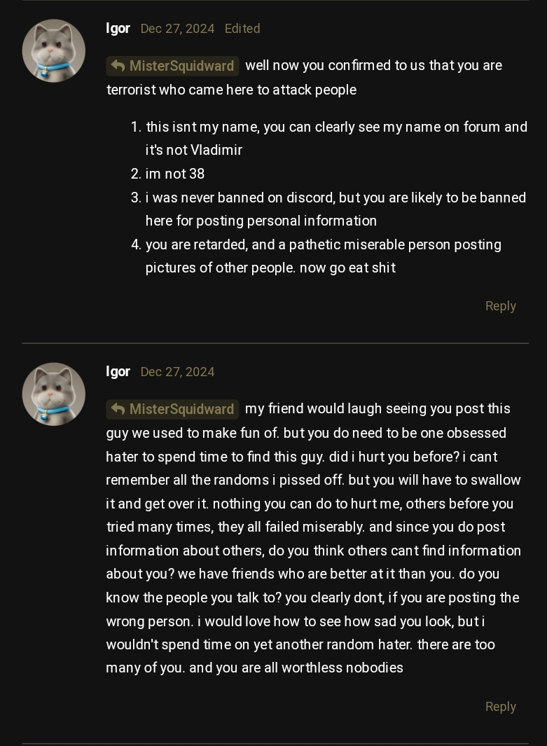 YaboiPoyo you are painfully dumb. you have no facts, just lies. i already replied to you about lying that i was "doxxed", but you did not even read my post. you are the one who still needs to answer for your bullshit and prove that the person, which photos was posted on this forum, is me. you were not able to prove lies you were spreading about me before and none of my haters were ever able to prove any of their lies. because if it is a lie, it is impossible to prove it. but reading losers like you embarrassing themselves by being unable to prove their lies is fun. and if you dont even read my replies, then there can be no conversation with you. other people can read what i already replied to you about your so-called "doxxing". and you still dont see yourself in the mirror and dont realize what piece of shit you are supporting stalkers posting photos of other people. from what we know about you, you are the lowest of the low. you may as well become a criminal with such behavior. it's due to your lack of brains that you cant get a proper job